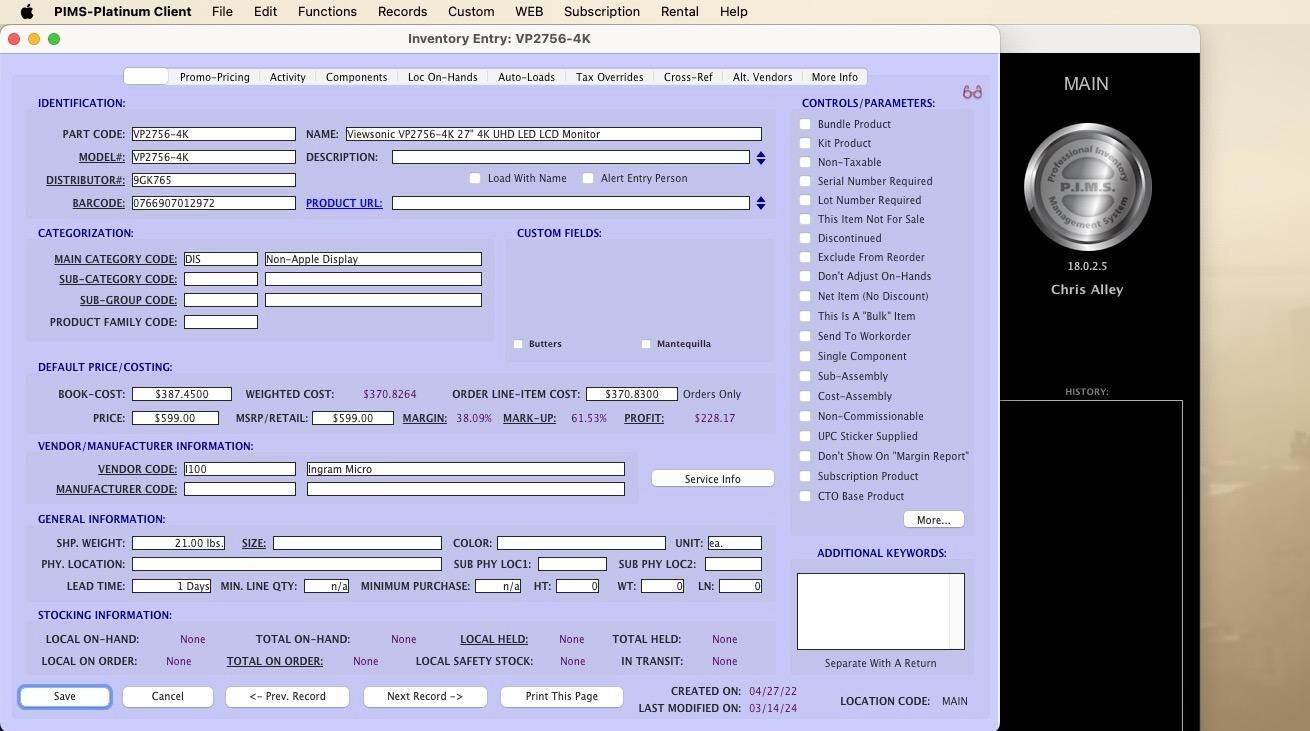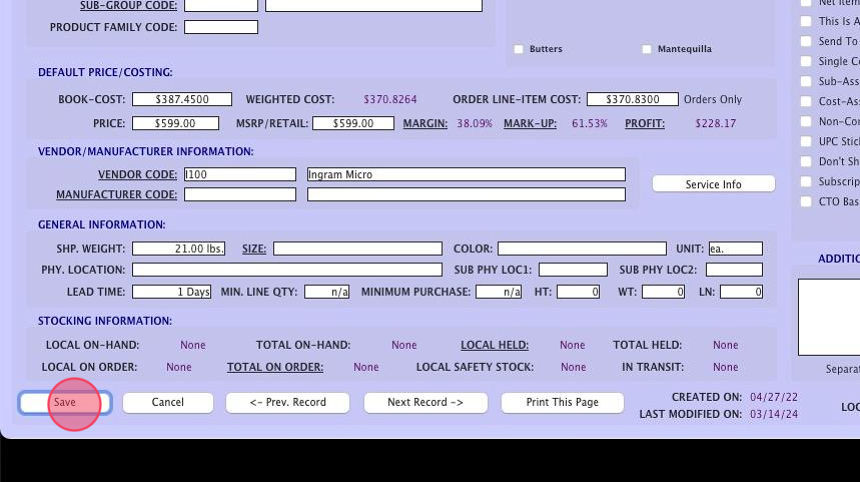 13. Click the Save button at the bottom-left of the Inventory Record.