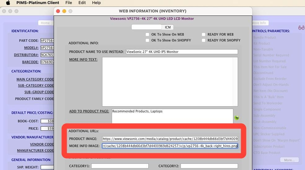 10. You can add up to two images to the Shopify listing by putting image URLs in the PRODUCT IMAGE and MORE INFO IMAGE fields. On the first sync, Shopify will upload the images into its image gallery. After the first sync, you must manage the images in the Shopify UI where you can add up to eight images.