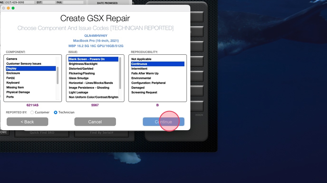 5. Click the "Continue" button and continue with setting up the repair as you normally would.